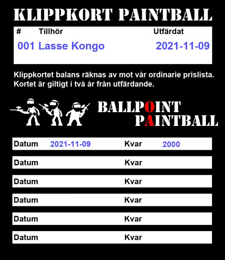 We now offer the Ballpoint Value Card for future paintball play. Valid for two years, the balance adjusted for each use. The actual balance is stored online, but you’ll get a physical card help keep track of your status.